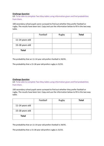 Probability From Two Way Tables Teaching Resources