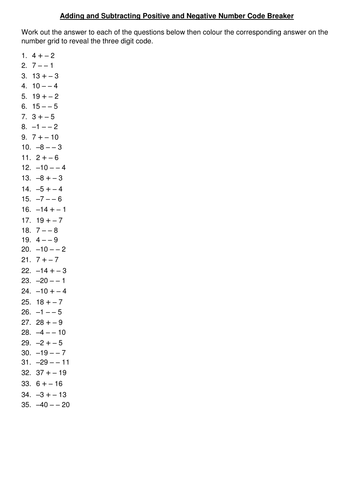 Adding And Subtracting Positive And Negative Numbers Worksheet By